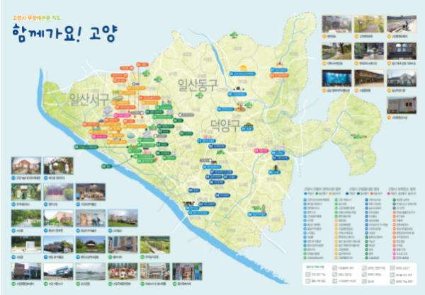 무장애 관광 지도는 고양시 전역의 주요 관광지, 음식점, 숙박업소 등 휠체어 이동이 편리한 장소를 표시한 지도다. 고양시 통합앱(app) 연계 모바일 콘텐츠와 종이 지도 리플릿 형태로 제작되었다.