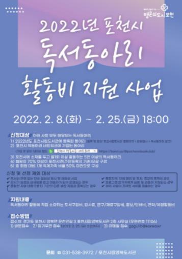 [한국뉴스타임=편집국] 포천시는 지역 주민의 독서 활동 기회를 보장하고 책과 함께하는 문화생활의 기반 조성으로 독서문화진흥 및 책 읽는 시민 스마트한 포천을 만들기 위해 ‘2022년 포천시 독서동아리 활동비 지원 사업’을 공모한다고 밝혔다.