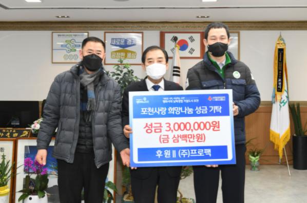 ㈜프로팩(대표 남경보)은 18일에 포천사랑 희망나눔 이웃돕기 성금 300만 원을 경기사회복지공동모금회를 통해 포천시에 기탁했다.