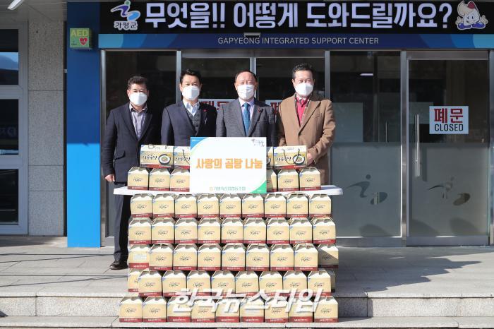 [한국뉴스타임=이명수기자] 지난 18일 가평축산업협동조합(조합장 조규용)에서 관내 불우이웃에게 사골곰탕 120박스(300만원 상당)를 기부하고, 가평군청 종합민원실 앞에서 전달식을 진행하였다.