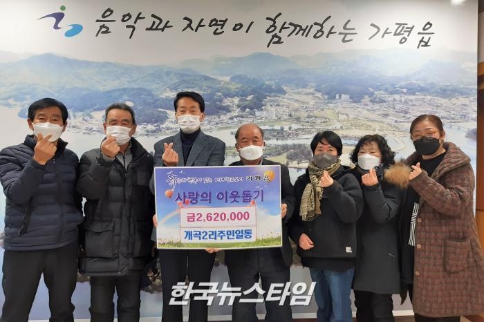 [한국뉴스타임=이명수기자] 가평군 가평읍 개곡2리 주민들은 어려운 이웃을 돕고자 뜻을 모아 준비한, 성금 262만원을 기탁하기 위해 금일 18일 이장과 주민 일동이 가평읍 행정복지센터를 방문했다.