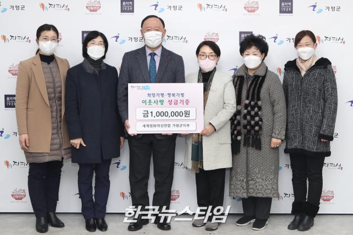 이에 김성기 가평군수는 “코로나19의 재확산으로 사회적 거리두기가 강화되어 모두가 힘들어하는 시기에 이웃돕기 성금을 기탁해주신 세계평화여성연합 가평군지부에 무한한 감사를 드리며, 기탁된 성금은 관내 어려운 이웃을 위해 소중히 사용할 것”이라며 감사의 인사를 전했다.