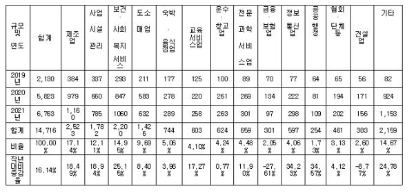 업종별 신고건수는 제조업 2,523건(17.14%), 보건사회복지서비스업 2,200건(14.95%), 기타 2159건(14.67%), 사업시설관리업 1,782건(12.11%) 순이다. 업종별 전년 대비 증가율을 보면 공공행정이 34.57%, 정보통신업이 34.23%, 보건사회복지서비스가 25.15% 증가했고, 기타도 24.78%나 증가했다.