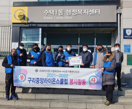 [한국뉴스타임=편집국] 구리시 구리중앙라이온스클럽(회장 오청록)은 20일 수택1동행정복지센터에서 설명절을 앞두고 이웃돕기 물품을 기탁하는 전달식을 개최, “희망 2022 나눔 캠페인”에 동참했다.