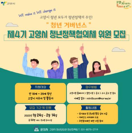 [한국뉴스타임=편집국] 고양시가 청년정책의 직접 수혜자이자 주인인 청년들의 정책의제 발굴 및 제안, 모니터링 등을 위한 고양시 청년정책협의체 제4기 위원을 2월 14일(월)까지 모집한다.