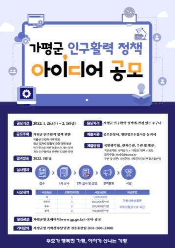 [한국뉴스타임=편집국] 가평군은 인구감소지역 지정에 따라 인구감소 및 지방소멸에 효과적으로 대응하고 지역특성에 맞는 주민수요 중심의 인구활력 증진 사업을 발굴하고자, 오는 1월 26일부터 2월 18일까지 ‘가평군 인구활력 정책 아이디어 공모전’을 개최한다.