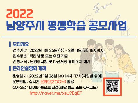 [한국뉴스타임=편집국] 남양주시는 25일 평생학습 활성화를 위한 ‘2022년 평생학습 공모 사업’을 추진한다고 밝혔다.