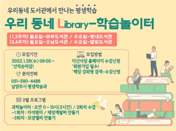 [한국뉴스타임=편집국] 남양주시는 지역 도서관 인프라를 활용한 평생학습 프로그램을 확대하기 위해 오는 2월부터 '우리 동네 Library-학습놀이터'를 운영한다.