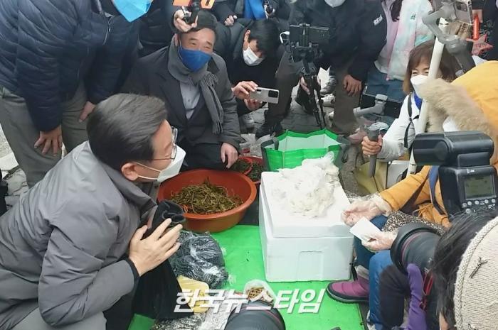 | ( 이재명 민주당 대선후보가 가평5일장에서 나물을 구입하고 있다. ) |