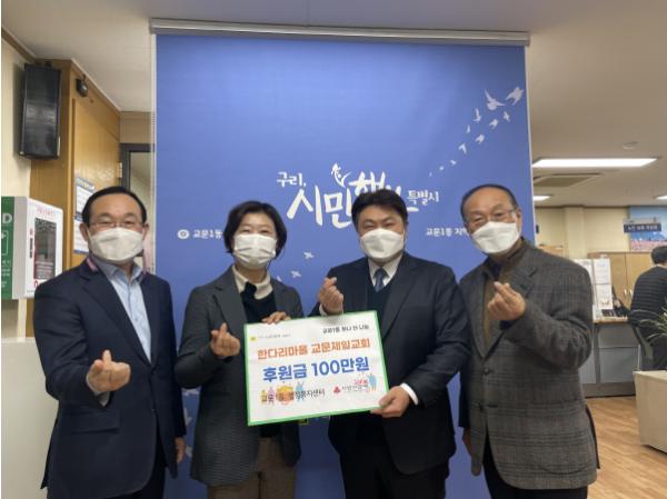 [한국뉴스타임=편집국] 구리시 교문1동은 25일 교문1동 한다리마을 교문제일교회(목사 황윤태) 후원으로 저소득 독거 어르신을 위한 후원금 100만 원 전달식을 개최했따.