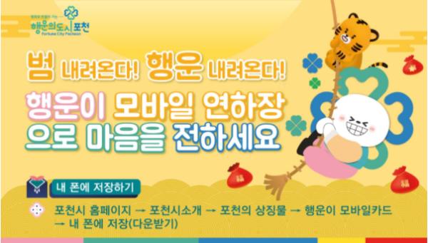[한국뉴스타임=편집국] 포천시가 지난해 시민들에게 큰 호응을 받은 ‘행운이’ 카카오톡 이모티콘에 이어 이번 설을 맞아 모바일 연하장을 무료로 배포한다. 시는 코로나19로 인해 올 설에도 직접 만나지 못하는 가족, 지인에게 설 인사를 전할 수 있도록 모바일 연하장 이미지를 25일부터 무료로 배포한다.