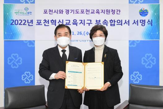 [한국뉴스타임=편집국] 포천시는 26일 포천교육지원청과 2022년도 혁신교육지구 부속합의서 서명식을 가졌다.