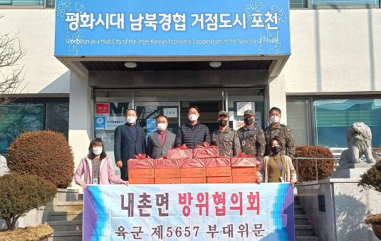[한국뉴스타임=편집국] 포천시 내촌면방위협의회는 26일 설 명절을 앞두고 지역방위태세 확립과 치안질서, 시민안전을 위해 최선을 다하고 있는 소방대원 및 군부대 등 관련기관을 격려하고 위문품(귤 5kg, 130박스)을 전달했다.