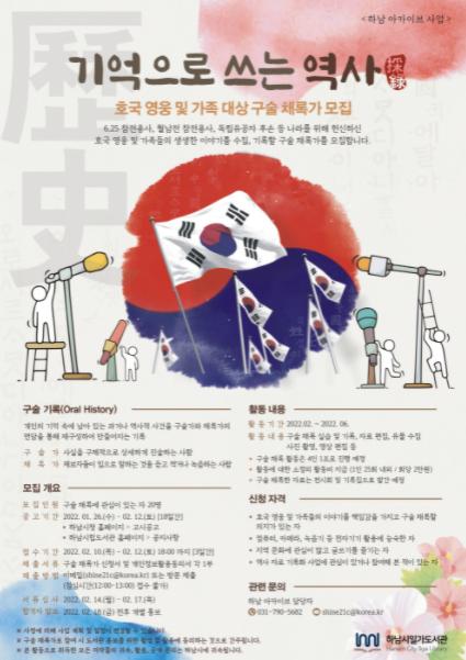 [한국뉴스타임=편집국] 하남시는 하남지역 호국 영웅 및 가족들의 생애사를 기록하는 ‘기억으로 쓰는 역사’ 구술 채록가 20명을 이달 26일부터 2월 12일까지 모집한다고 밝혔다.