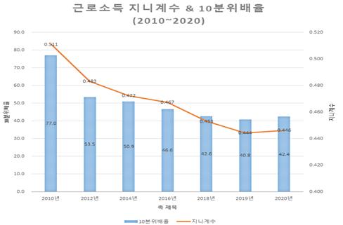 국세청 제공 100분위 자료를 통해 분석한 근로소득의 분배지표는 코로나 발발 이전인 2019년까지 개선 일로였다. 소득 상위 10%의 소득(이하 총급여 기준)을 하위 10%의 소득으로 나눈 값인 10분위 배율은 2010년에 77.0배에서 2019년에는 40.8배로 대폭 개선되었다. 하지만 2020년에 10분위배율이 42.4배로 상승했다.