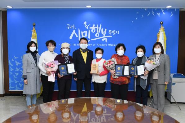 구리시는 수상을 기념하기 위해, 4일 구리시청 3층 민원상담관실에서 ‘사랑나누미’ 회원 등 10여 명이 참여한 가운데, 경기도 생명사랑 자원봉사 프로젝트 공모사업 우수 프로그램 인증패 기념식을 개최했다.