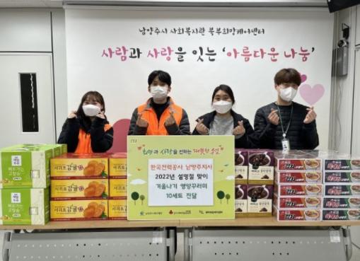 [한국뉴스타임=편집국] 남양주시 다산동에 소재한 한국전력공사 남양주지사(지사장 박진필)는 7일 저소득 소외계층을 위해 준비한 ‘설 명절맞이 겨울나기 영양꾸러미’ 10세트(50만 원 상당)를 남양주시 북부희망케어센터(센터장 전정수)에 전달했다.