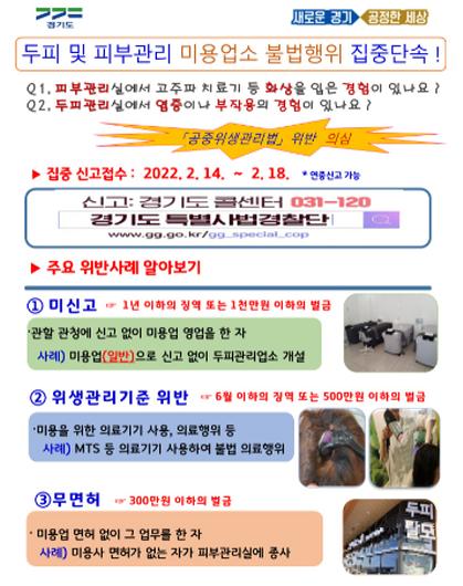 [한국뉴스타임=편집국] 경기도 특별사법경찰단이 최근 탈모환자 증가에 따른 두피?탈모 관리서비스 시장 확대에 따라 2월 14일부터 18일까지 수원, 화성, 용인, 오산, 고양, 파주 6개 지역에서 규모가 큰 가맹점 위주로 두피 및 피부관리 미용업소 90개소를 대상으로 미신고?무면허 등 불법행위를 집중 수사한다.