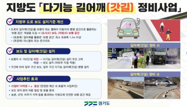 ‘다기능 길어깨(갓길) 정비사업’은 한정된 재원 내에서 도민들이 안전하게 이용할 수 있는 지방도 내 보행 공간 설치 요구에 적극적으로 부응하고자 경기도가 올해 새로 도입한 사업이다.