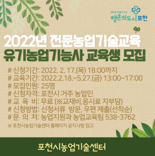 [한국뉴스타임=편집국] 포천시농업기술센터는 오는 17일까지 ‘2022년 전문농업기술교육 유기농업기능사 교육’ 수강생을 모집한다.