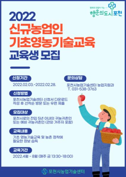 [한국뉴스타임=편집국] 포천시농업기술센터는 오는 28일까지 ‘2022년 신규농업인과 기초영농기술교육’ 교육생 40명을 선착순으로 모집한다고 밝혔다.