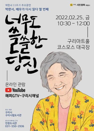 [한국뉴스타임=편집국] 구리시는 박완서 작가 타계 11주기를 기억하고 작가의 문학적 업적을 추모하며 그리움을 나누기 위해 오는 25일 구리아트홀 코스모스 대극장에서 추모 낭독공연인 '박완서, 배우가 다시 읽다'를 개최한다고 밝혔다.