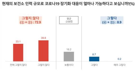 우선 현재 보건소 인력 규모로 국내 코로나19 장기화 대응이 가능한지 묻는 말에 응답자 72.9%가 ‘어렵다’고 했다. ‘보통’은 18.2%, ‘가능하다’는 8.9%에 그쳤다.