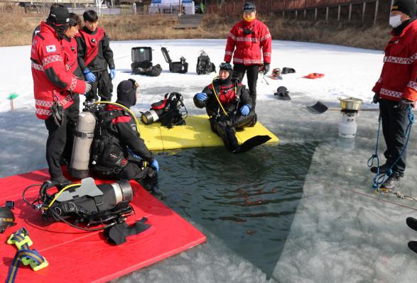 훈련 주요 내용으로는 ▲겨울철(해빙기) 수난구조 절차·기법 등 이론교육과 ▲건식 잠수장비 등 적응훈련 ▲ 얼음물, 얼음 밑 잠수 적응훈련 ▲ 수중탐색 및 인양 훈련 ▲ 익수환자 응급처치 등이다.