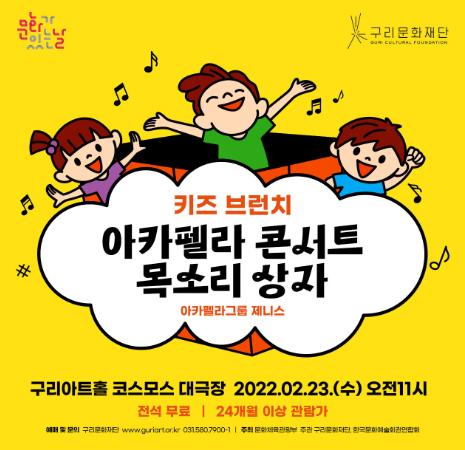 [한국뉴스타임=편집국] 구리문화재단이 2월 문화가 있는 날을 맞아 23일 ‘온가족이 즐기는 키즈 브런치 , 아카펠라 그룹 제니스와 함께하는 목소리 상자’를 개최한다고 밝혔다.