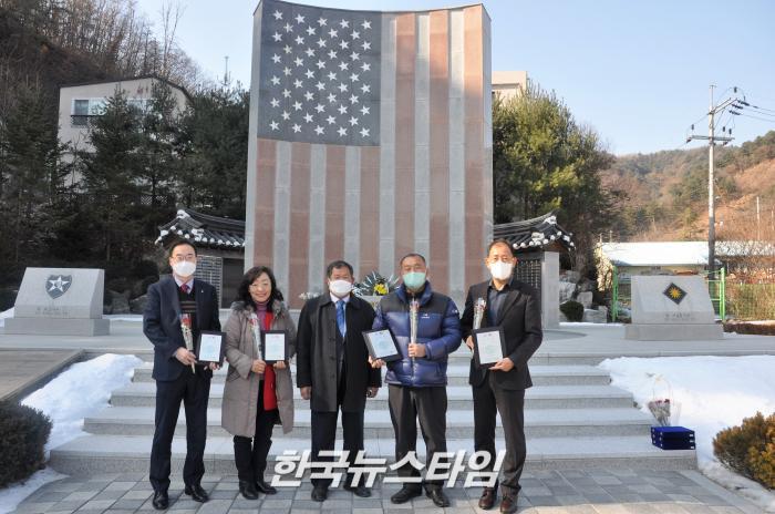 [한국뉴스타임=이명수기자] 한국전쟁맹방국용사선양회(회장 최승성)는 10일 가평군 북면에 위치한 ‘한국전쟁 미군참전 기념비‘ 건립 6주년을 맞이하여 공로패와 감사패를 전달하였다.