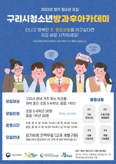 2022년 구리시 청소년방과후아카데미 사업 내용은 ▲ 돌봄 서비스: 교과학습(국어, 영어, 수학), 주중체험프로그램(뮤지컬, 방송댄스, 한국사, 논술), 주말체험프로그램(캠프, 일일체험활동), 지역연계프로그램 등 ▲ 생활 지원 서비스: 급식 지원, 의료 지원, 상담 지원 ▲ 동아리 프로그램: 동아리(미술부, 환경부, 4차산업부)등의 프로그램이 운영되고 있다.