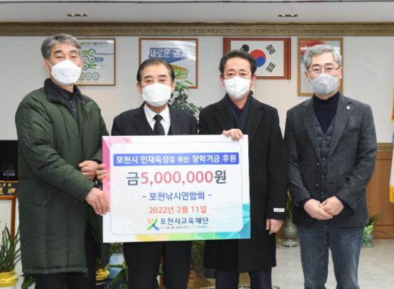 [한국뉴스타임=편집국] 포천낚시연합회는 11일 (재)포천시교육재단(이사장 박윤국)을 방문해 장학금 500만 원을 전달했다.