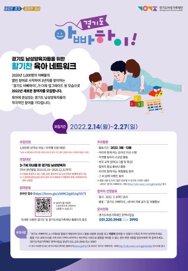모집 대상은 3~7세 자녀(2016년 1월 1일부터 2020년 12월 31일생)를 둔 경기도 남성 양육자다. 2월 14일부터 27일까지 경기도여성가족재단 누리집 온라인 접수 페이지로 접수하면 된다.