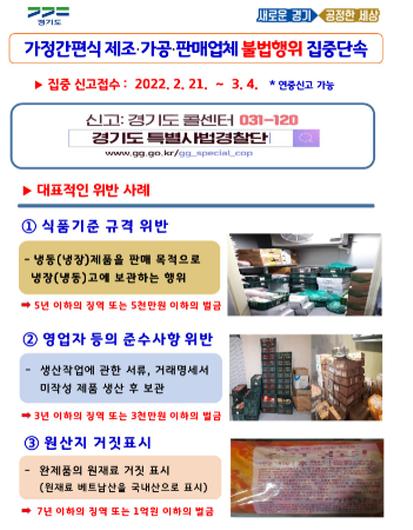 [한국뉴스타임=편집국] 경기도 특별사법경찰단이 코로나19로 온라인 식품거래와 가정간편식 수요가 증가함에 따라 관련 제조·판매업체의 불법행위를 2월 21일부터 3월 4일까지 집중 수사한다.