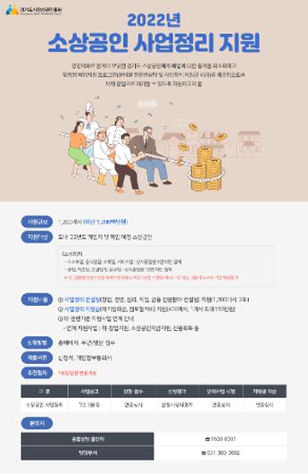[한국뉴스타임=편집국] 경기도와 경기도시장상권진흥원은 코로나19 상황의 지속적인 악화로 인해 극심한 어려움을 겪고 있는 경기도 소상공인들의 불확실한 경영환경에 대응하여, 폐업율 완화 및 불가피한 폐업자의 안정적인 연착륙을 돕고자 ‘2022년 경기도 소상공인 사업정리 지원사업’을 추진한다고 밝혔다.