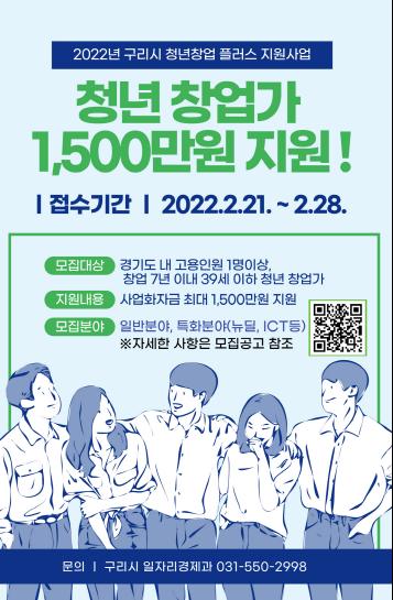 구리시는 2022년 행정안전부의 지역주도형 청년일자리사업(2유형)에 선정됨에 따라, 전년도 대비 지원금을 대폭 높여 1억 5천만원의 예산 투입으로 청년 창업가들이 지역을 기반으로 안정적인 일자리창출을 도모할 수 있도록 지원하겠다는 계획이다.