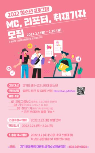[한국뉴스타임=편집국] 경기도교육청이 2022학년도에 청소년방송을 이끌어 갈 프로그램 사회자, 보도자, 기자를 모집한다.