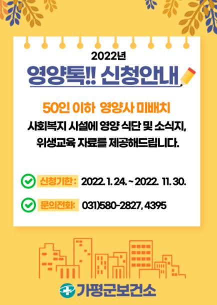 현행법상 50인 이상 시설에만 ‘영양사 의무배치’ 규정이 적용되어, 관리가 필요한 소규모의 시설은 영양사가 없어 식단 작성 및 위생 관리에 어려움을 겪고 있다. 이에 가평군 보건소에서는 코로나19 비대면 영양 사업으로 식단 작성에 어려움이 있는 사업장을 대상으로 월 1회씩 12회차에 걸쳐 식단표, 영양소식지, 조리종사자 위생교육 자료를 제공하는 ‘영양톡’을 1월부터 12월까지 운영할 예정이다.