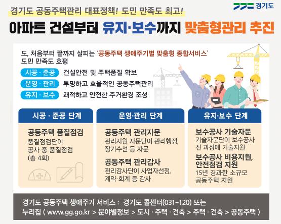 ‘경기도 공동주택 생애주기별 맞춤형 지원서비스’란 사람의 생애를 유아기, 청년기, 노년기 등으로 구분한 것처럼 공동주택을 ▲시공?준공 ▲운영?관리 ▲유지?보수 단계로 나눠 처음부터 끝까지 주택에 필요한 서비스를 적기에 지원하는 경기도형 공동주택관리 정책이다.