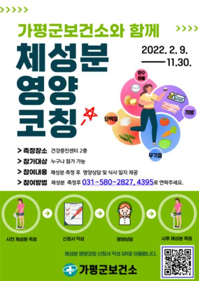 가평군보건소에서는 개인 건강관리에 어려움을 겪고 있는 군민에게 도움을 주고자 개인의 체성분을 측정 후 개별적으로 적합한 전문적인 영양 정보를 제공하고 영양불균형을 해소하는데 도움을 주는 ‘체성분 영양코칭’ 프로그램을 운영한다.