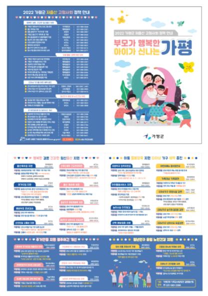 2022년 가평군이 추진하는 저출산?고령사회 정책들을 군민이 필요한 혜택을 한눈에 파악할 수 있도록 홍보리플렛을 구성?제작하였으며, 군민들의 왕래가 잦은 읍?면 행정복지센터, 보건소 등에 비치하고 군부대 등 관내 유관기관 및 다중이용장소에 배포하여 적극적으로 홍보할 예정이다.