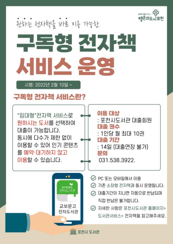 포천시의 ‘구독형 전자책 서비스’는 포천시립도서관 도서대출 회원이라면 누구나 도서관 홈페이지와 스마트폰 앱을 통해 1인당 매월 10권, 14일간 이용할 수 있다.