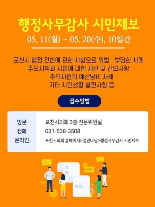 시의회는 "이달 11일부터 20일까지 10일간 행정사무감사와 관련한 시민제보를 받는다"라고 밝혔다. 시민제보 제도는 포천시의회 행정 사무감사특별위원회 임종훈 위원장이 제안한 것으로 전해진다.
