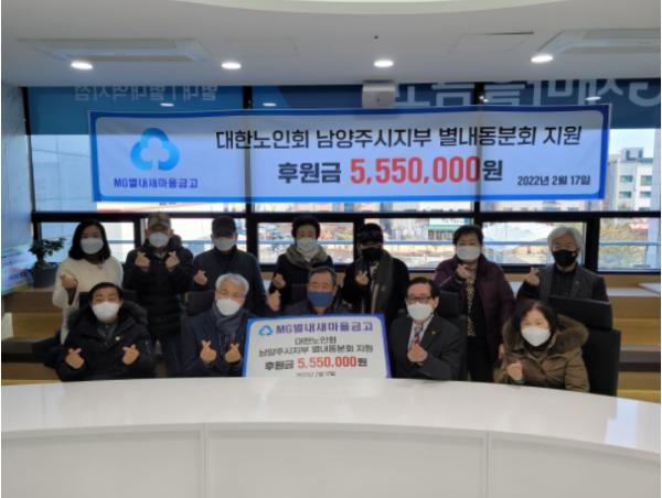 [한국뉴스타임=편집국] 남양주시 별내새마을금고(이사장 남경우)는 지난 17일 대한노인회 남양주시지회 별내동분회에 후원금 555만 원을 전달했다.