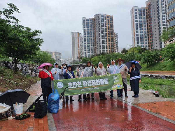 지난 9일 호평동 하천환경지킴이로 호만천을 담당하고 있는 주민자치위원회(위원장 권순욱)는 비가 오는 궂은 날씨에도 위원 10여 명이 참여한 가운데, 무단투기 쓰레기를 수거하고, 금배공원 생태 화단에 초화류를 식재했다.