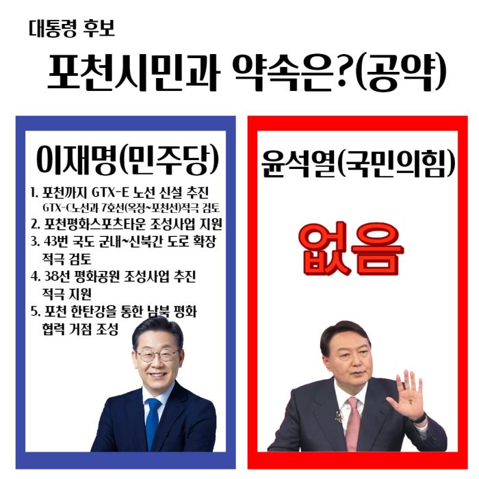 끝으로 지역 공약이 아무것도 없이 오직 정권교체만 외치는 앵무새 같은 후보와 위기에 강하고 유능한 경제대통령 이재명을 비교해주시길 바랍니다. 그리하여 이번 대선은 지역 공약뿐 아니라 과거 이재명 후보의 성남시장과 경기도지사 시절 공약 이행률 95% 성과와 국민을 위한 공약으로 유능과 무능을 판가름해야 합니다. 포천 발전과 포천 경제를 향상시킬 수 있는 후보를 선택하여 3월 9일 정치교체가 되도록 포천시민 여러분의 슬기로운 혜안으로 선택을 부탁합니다.