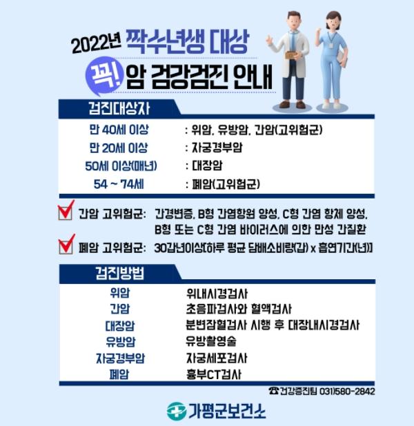 가평군보건소에 따르면 우리 주변에 흔하게 발생하는 6대 암(위암·대장암 ·간암·유방암·자궁경부암·폐암)은 국가 암검진 대상이며, 비교적 간단한 검진을 통해 조기 발견이 가능하며 조기에 발견시 암으로 인한 사망률이 30%이상 감소한다. 특히, 자궁경부암의 경우 70%이상 사망률이 감소한다.