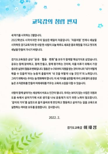 이재정 교육감은 이 기간에 청렴편지를 통해 직원들의 청렴문화 확산을 강조했다. 이 교육감은 “고위직의 솔선수범과 모든 교직원의 청렴 실천이 청렴한 미래세대를 키우는 원동력”이라며 “청렴은 기본, 예방이 우선, 자발적인 문화로 확산하는 청렴정책을 추진해 공정하고 청렴한 경기교육을 실현을 위해 노력해달라”고 당부했다.