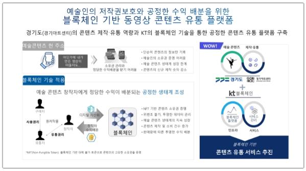 경기도는 KT와 컨소시엄을 구성해 지난해 5월 한국인터넷진흥원이 주관한 ‘2021년 블록체인 선도시범사업’ 과제로 선정돼 이번 사업을 추진하게 됐다. 코로나19로 무대를 잃은 예술인들이 비대면 무대 영상을 온라인에 올리고 있지만, 소유권 보호가 되지 않아 관련 수익을 배분받지 못하는 현실을 개선하기 위한 시도다.