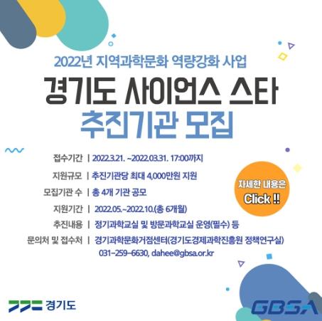 지난해부터 시작한 ‘사이언스 스타’ 사업은 경기도가 지역과학문화 생태계 구축을 위해 추진하는 ‘지역과학문화 역량강화 특화 사업’의 하나로, 도는 추진기관 4곳을 선발할 계획이다.